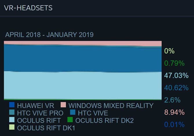Gerade einmal 0,91 % der Steam-Nutzer im Januar haben sich für ein VR Headsets entschieden. Bei knapp 90 Millionen Steam Nutzer gibt es also 819.000 VR Headsets. Das ist ein Zuwachs von 13,75 % im Vergleich zu Dezember 2018. Damals gab es lediglich 720.000 VR Headsets unter den Nutzern.