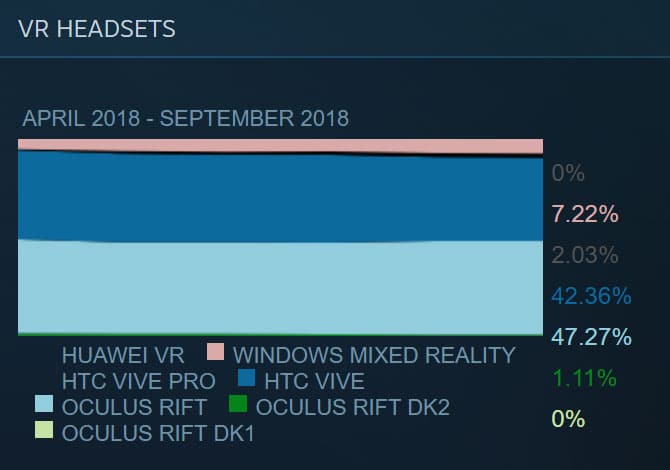 Der Oktober hat angefangen und das bedeutet es gibt eine neue Steam VR Statistik über die verwendeten VR Headsets im September 2018. Neu in der Statistik ist die Aufnahme der HTC Vive Pro und der Huawei VR. Beide Headsets waren im August noch nicht aufgeführt.